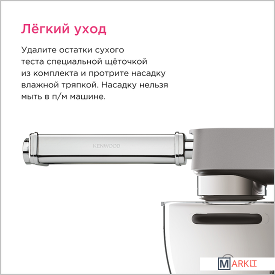 Насадка для кухонного комбайна Kenwood KAX99.A0ME станет незаменимым помощником в раскатывании теста для пасты. ИТАЛЬЯНСКИЕ БЛЮДА НА ДОМАШНЕЙ КУХНЕ Настоящую пасту можно готовить дома с помощью насадки для кухонного комбайна Kenwood KAX99.A0ME. Тесто после раскатки на насадке от Kenwood получается ровным, гладким и идеальной толщины для дальнейшего приготовления пасты. Получите более широкие листы с насадкой 22см. Благодаря 10 настраиваемым режимам Вы можете получить тесто необходимой ширины для приготовления лазаньи, равиоли и тортеллини. Широкая насадка идеально подходит для приготовления лепешек и питты. Насадка удобна в использовании. Ее можно с легостью очистить после использования, к ней не прилипает тесто, не деформируется и не поддается коррозии, а так же в комплекте идет щеточка, которая сделает уход за насадкой еще более простым. Важно, насадку нелья мыть, только протирать влажной салфеткой.